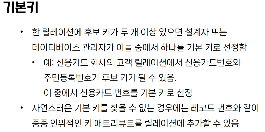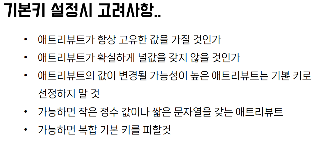관계형 데이터베이스의 특성으로 인해 기본키는 테이블마다 1개씩은 있어야 함.