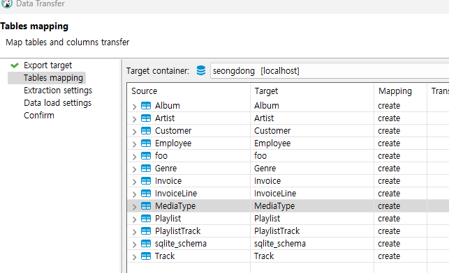 데이터 가져오기에서 소스는 출처고 타겟은 보내는 곳임
