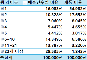 원래 표에서 보니까 주문량이 22개 이상에서 1% 미만으로 떨어짐.
