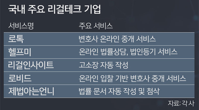 리걸테크는 법률(Legal)과 기술(Technology)의 결합으로 새로운 유형의 법률 서비스를 제공하는 것을 말한다. 리걸테크 영역은 크게 △변호사를 쉽게 찾을 수 있도록 지원하는 검색 서비스 △판결문 및 법률 정보 검색 서비스 △법률 문서 자동 작성 서비스 △행정업무 지원 솔루션과 같이 데이터 분석을 기반으로 시간과 비용을 줄여주는 합리적인 법률 서비스 △AI(인공지능)를 활용한 소송 결과 예측 등 법적 견해를 제공하는 서비스 등이다.