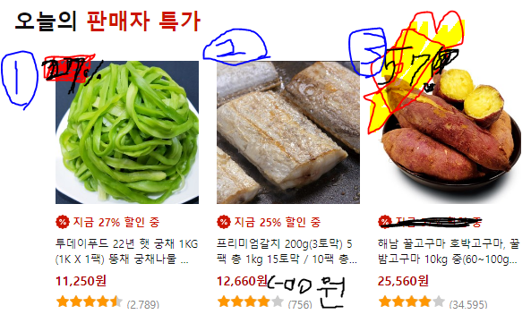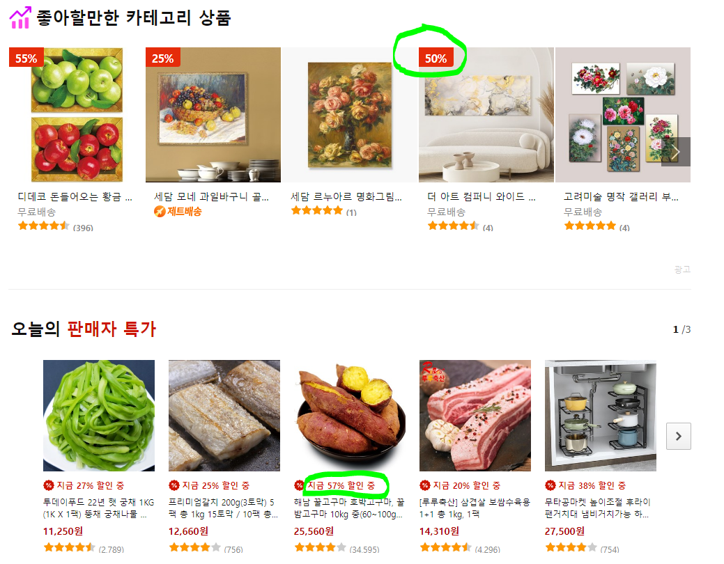 이 부분에서 오늘의 특가 상품이 몇 퍼 할인하는지 눈에 덜 띄고 위에 카테고리 상품이랑 할인율 표시가 다르잖은가?