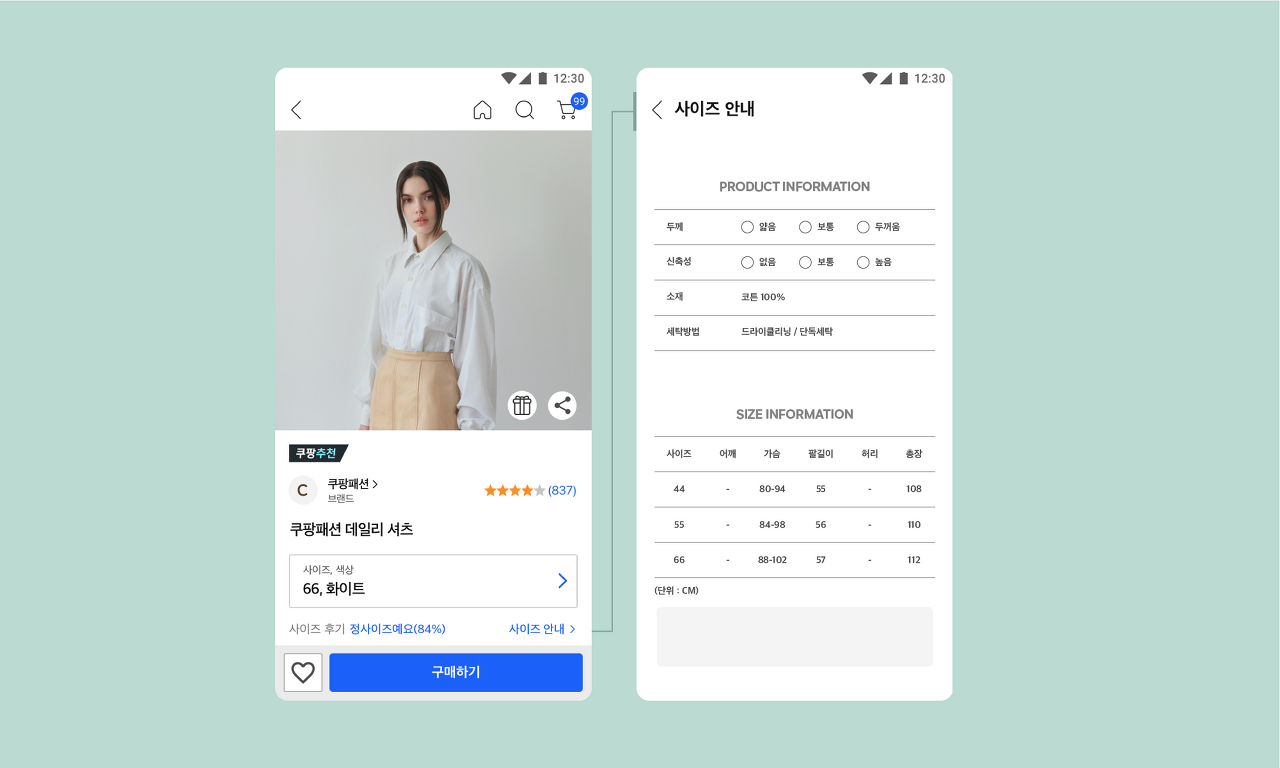 A안은 상품 상세설명에서 사이즈표를 찾아봐야 하는 기존 안으로, B안은 사이즈를 잘 보이도록 재구성하는 안으로 설정했다.