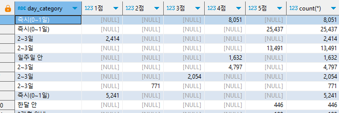 SQL로는 잘 안되어가지고 걍 엑셀로 데이터 데려가서 피벗이랑 X룩업 했습니다.