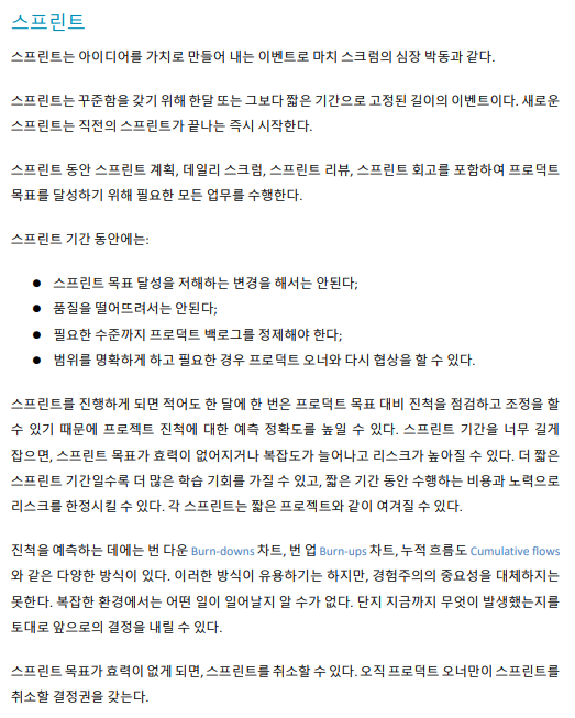 스크럼 가이드에서 '스프린트'가 설명된 부분이다.